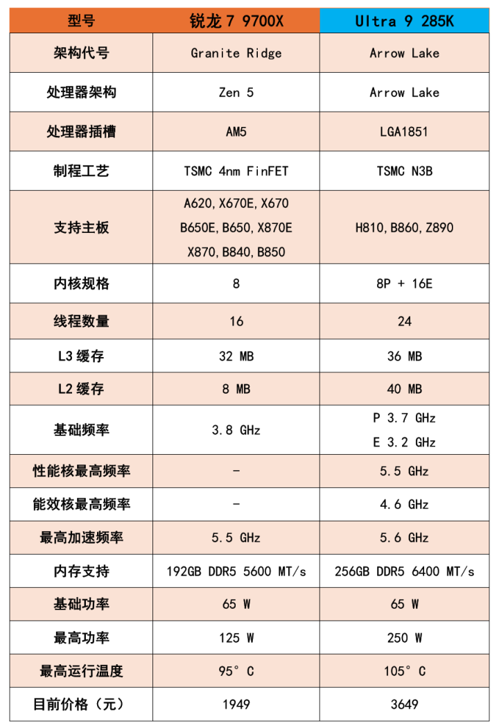 更重要的一点是,锐龙7 9700X的价格只有酷睿Ultra 9 285K的一半多一点,但却能获得90%的游戏体验,性价比是相当的高了。另外一点,锐龙7 9700X所使用的AM5平台会继续沿用到2027年,因此这颗处理器有着大把的主板可以用,X870、B850、X670,甚至是B650都可以适配,相比酷睿Ultra 9 285K仅能选择Z890或B860等主板,整体装机成本更低。