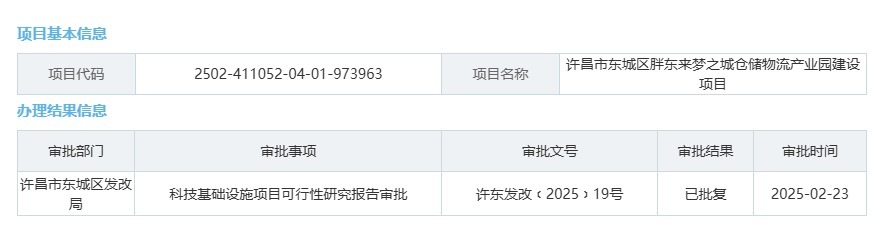 记者注意到,胖东来梦之城仓储物流产业园建设项目可行性研究报告,已于2月23日通过许昌市东城区发改局审批。