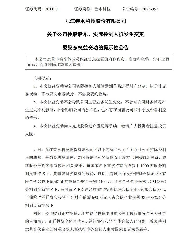 11月7日晚间,善水科技突然公告称公司实际控制人黄国荣和吴新艳解除婚姻关系,并进行财产分割。黄国荣直接持有的股份中1000万股分割到吴新艳名下,同时黄国荣间接持有的股份,包括正祥投资和泽祥睿宝投资的财产份额分割到吴新艳名下。此外,正祥投资和泽祥睿宝投资的执行事务合伙人由黄国荣变更为吴新艳。本次权益变更前,黄国荣与吴新艳为公司的共同实际控制人,黄国荣为公司控股股东,本次权益变动后,吴新艳为公司的实际控制人、控股股东。