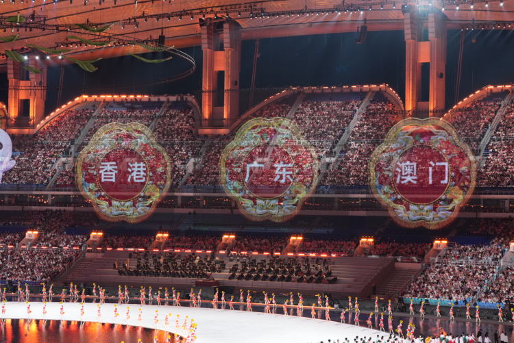 本届全运会东道主粤港澳代表团一起入场。(人民日报记者 黄鹏飞、巩晗)